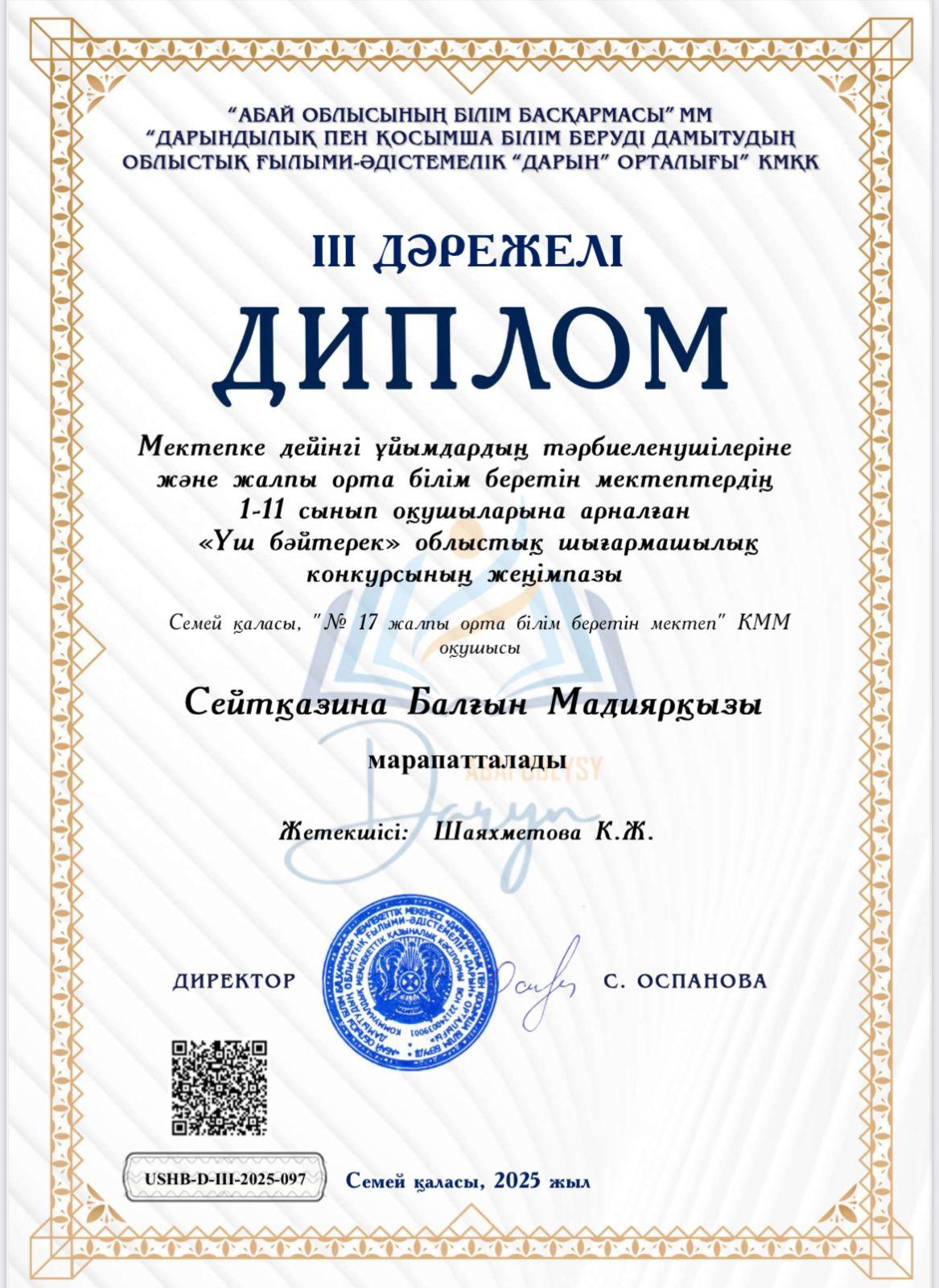 III дәрежелі дипломмен марапатталды.