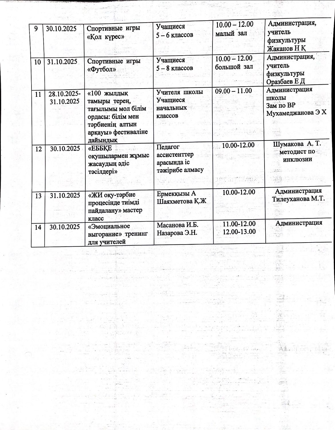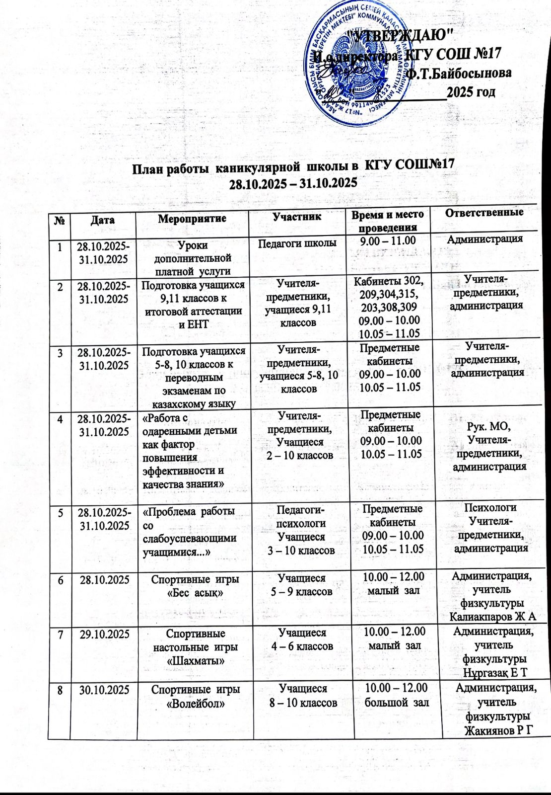 План работы каникулярной школы (28.10.2025-31.10.2025) » КГУ СОШ № 17