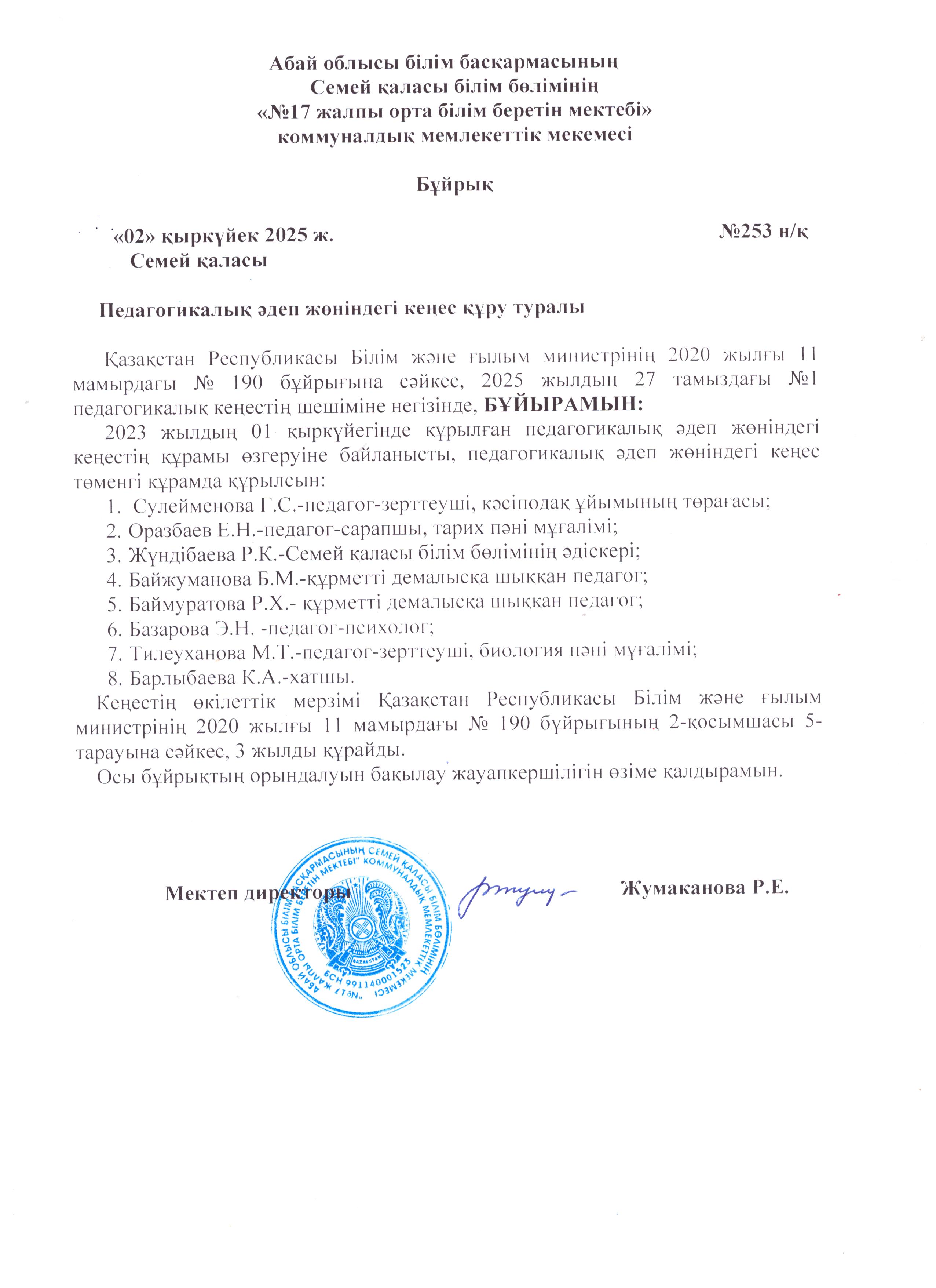 Педагогикалық әдеп жөніндегі кеңес құру туралы » КГУ СОШ № 17