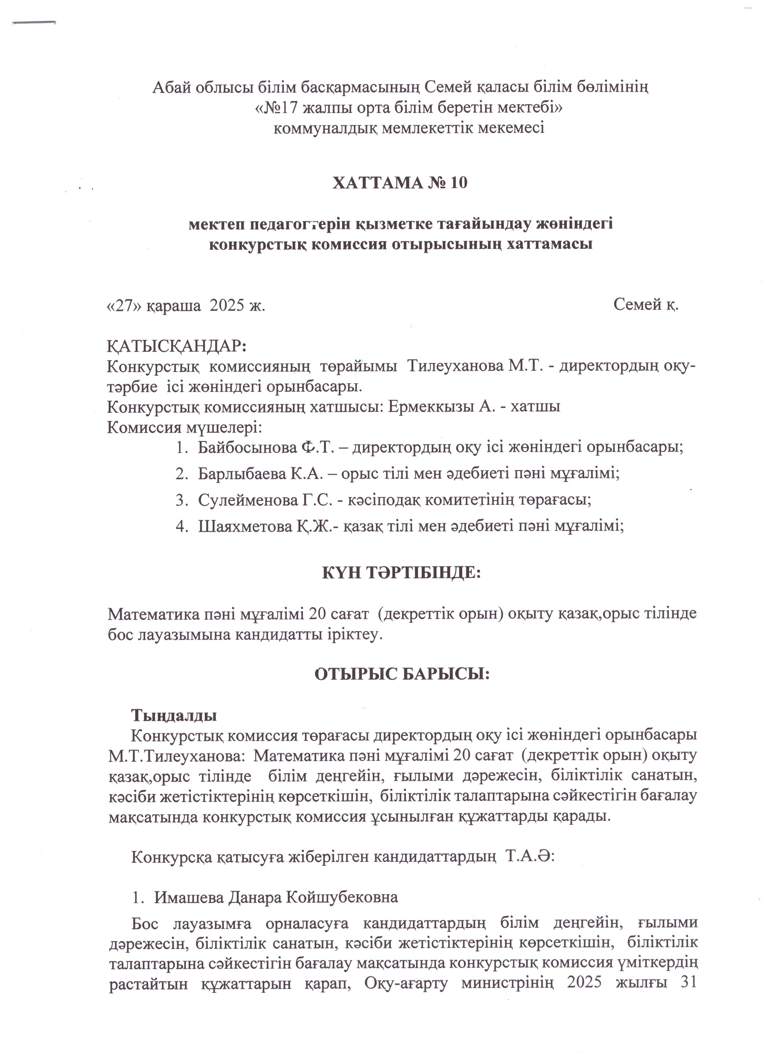 Результаты конкурса на должность учителя математики » КГУ СОШ № 17