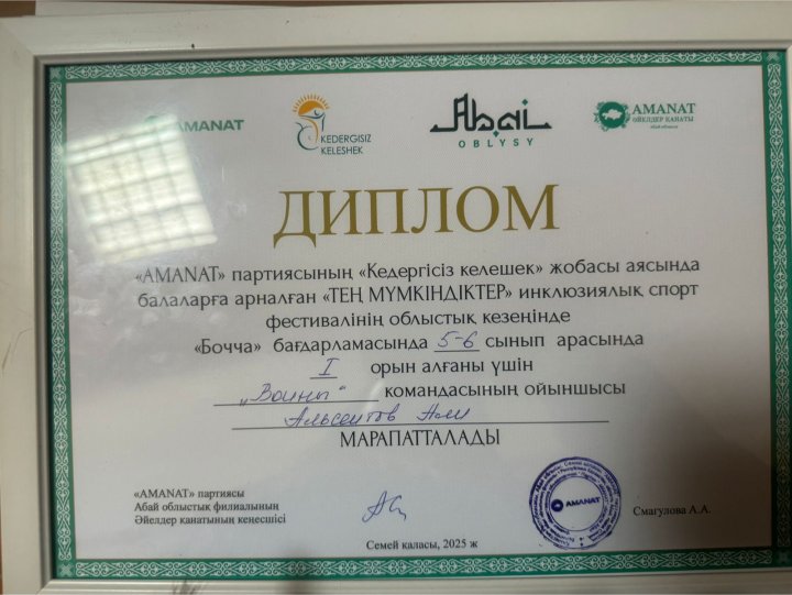 Ученики 6 класса — Альсеитов Али, Чукалин Иван и Анетов Аңсар — заняли I место на областном этапе инклюзивного спортивного фестиваля «Тең мүмкіндіктер» (проект «Кедергісіз келешек» партии AMANAT) в программе «Бочча» и получили путёвку на Республиканский этап.