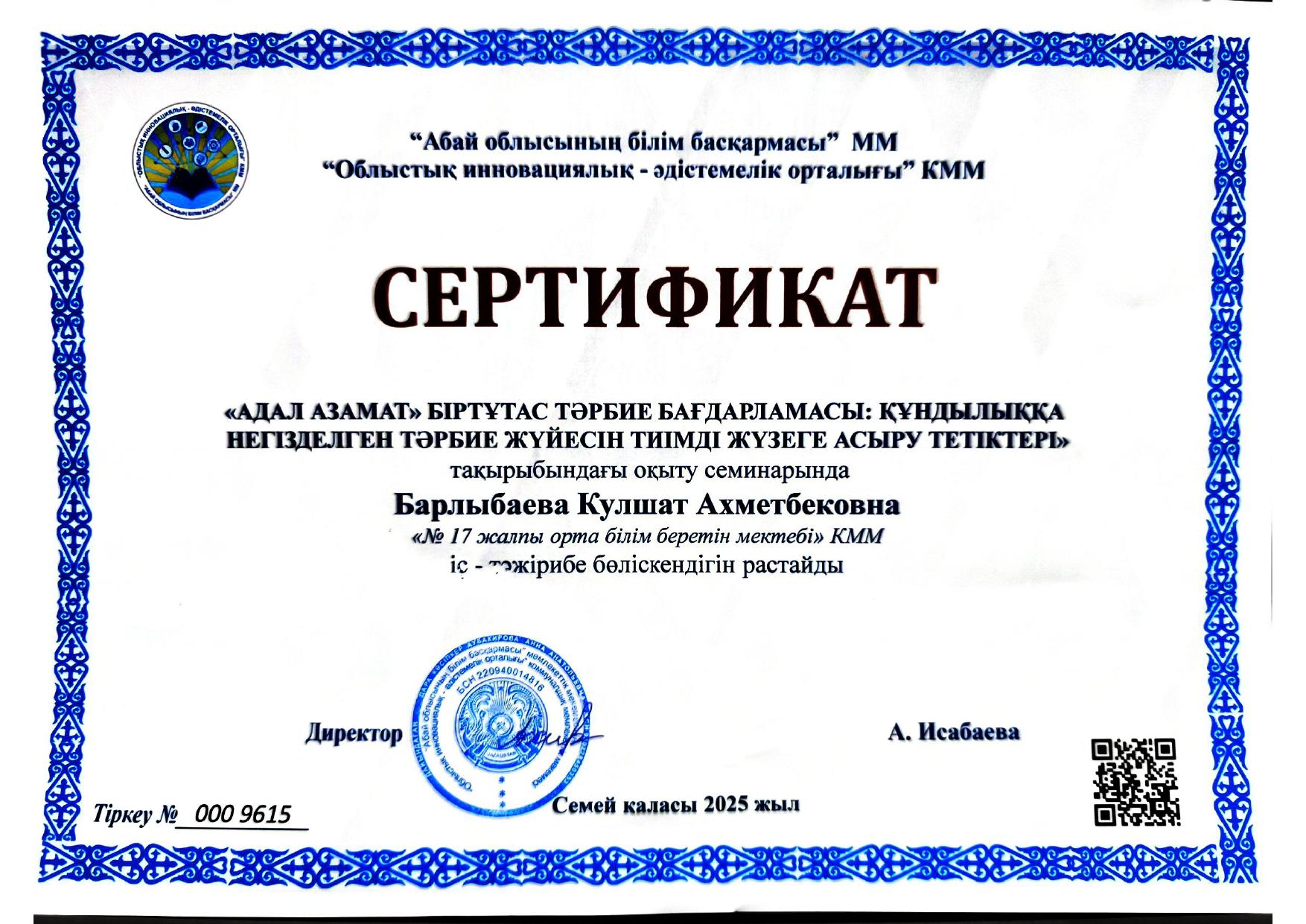 Семинар аясында орыс тілі мен әдебиеті пәні мұғалімі Барлыбаева К.А. «“Адал Азамат” құндылықтарын пән мазмұнына интеграциялау» тақырыбында баяндама жасап, бағдарламаны оқу-тәрбие үдерісіне енгізу тәжірибесімен бөлісті. Сондай-ақ, оқушылардың құндылықтық бағдарларын қалыптастыруға бағытталған тиімді әдістер ұсынылды.