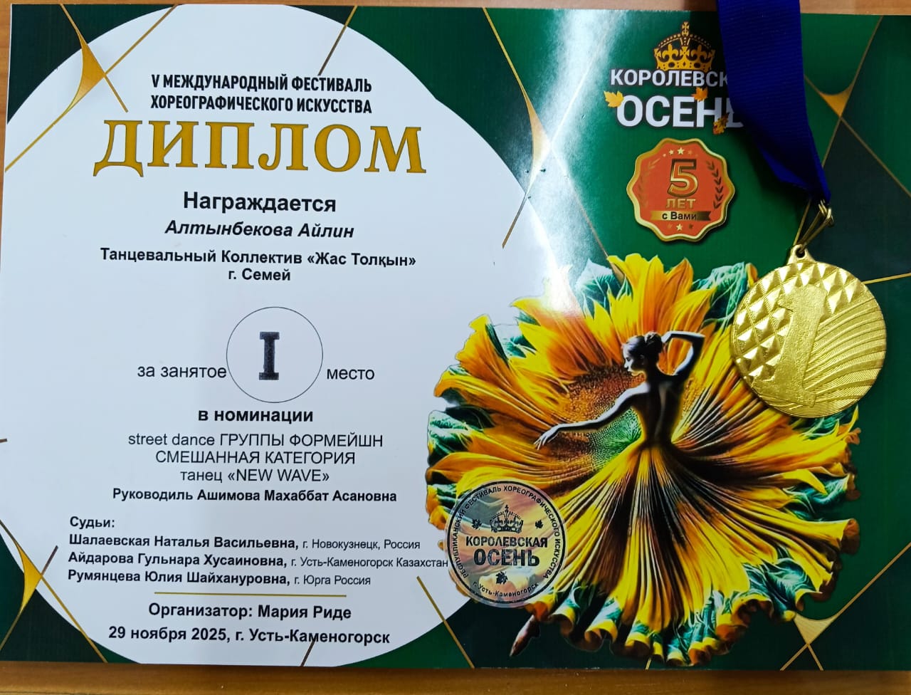 Ученица 4,,В" класса Алтынбекова Айлин участвовала в V Международном фестивале хореографического искусства в танцевальном коллективе ,,Жас Толкын" и получила Гран -при в номинации народно- стилизированный танец и 1 место в номинации street dance.