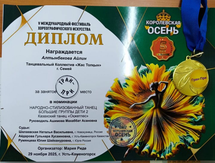 КГУ "Средняя общеобразовательная школа № 17" » Тәрбие жұмысы » Жетістіктер » Ученица 4,,В" класса Алтынбекова Айлин участвовала в V Международном фестивале хореографического искусства в танцевальном коллективе ,,Жас Толкын" и получила Гран -при в номинации народно- стилизированный танец и 1 место в номинации street dance.